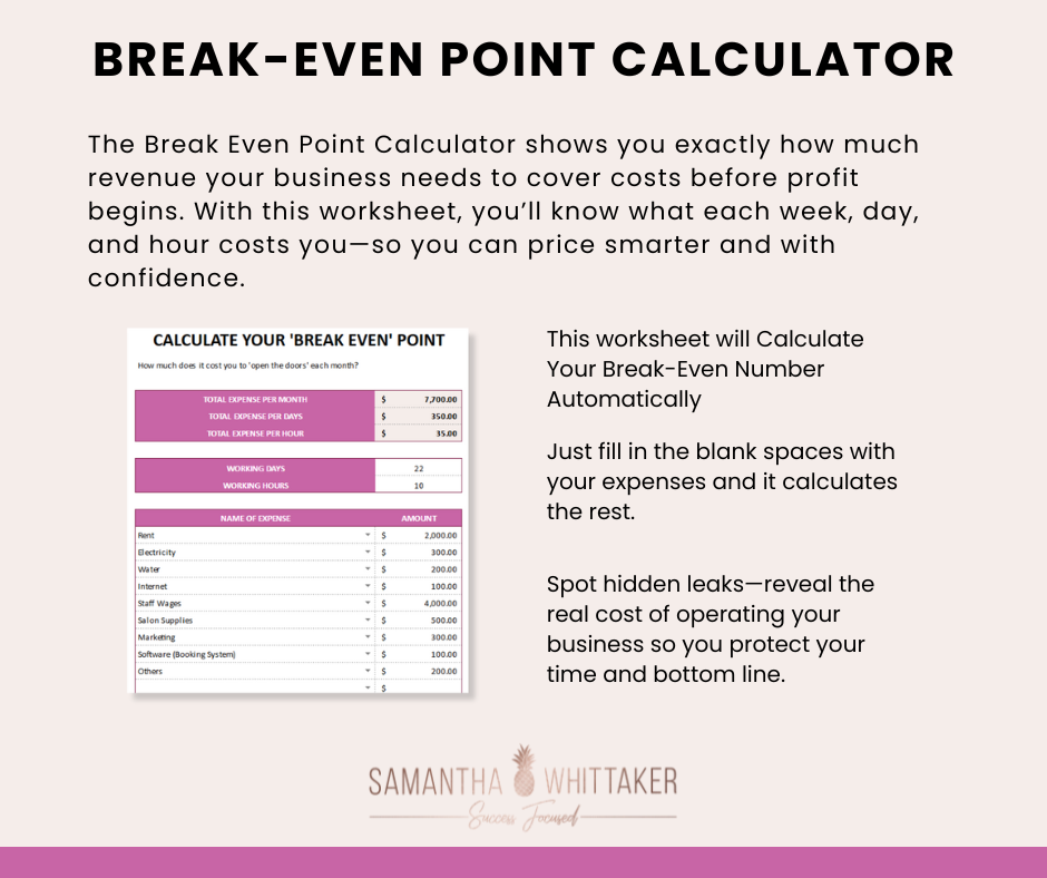 This Break Even Point Calculator gives you a clear picture of exactly how much revenue your business needs to cover costs before any profit can begin. With this insight, you can confidently know what a week costs you, day costs you, an hour costs you and you can price better.
